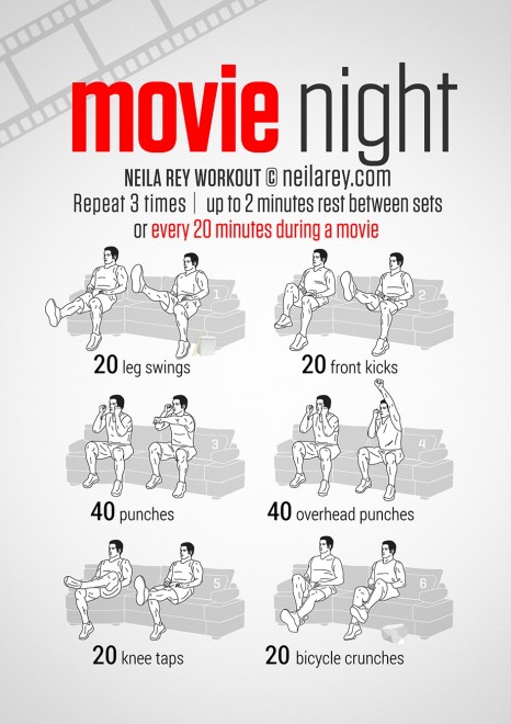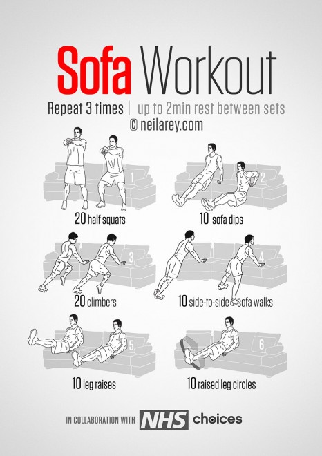 Da eseguire ogni intervallo, ogni stop pubblicitario o almeno ogni venti minuti, ecco una serie di esercizi per tenersi in forma anche restando seduti sul divano. A proporli è l'illustratrice americana Neila Rey